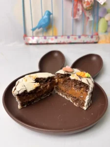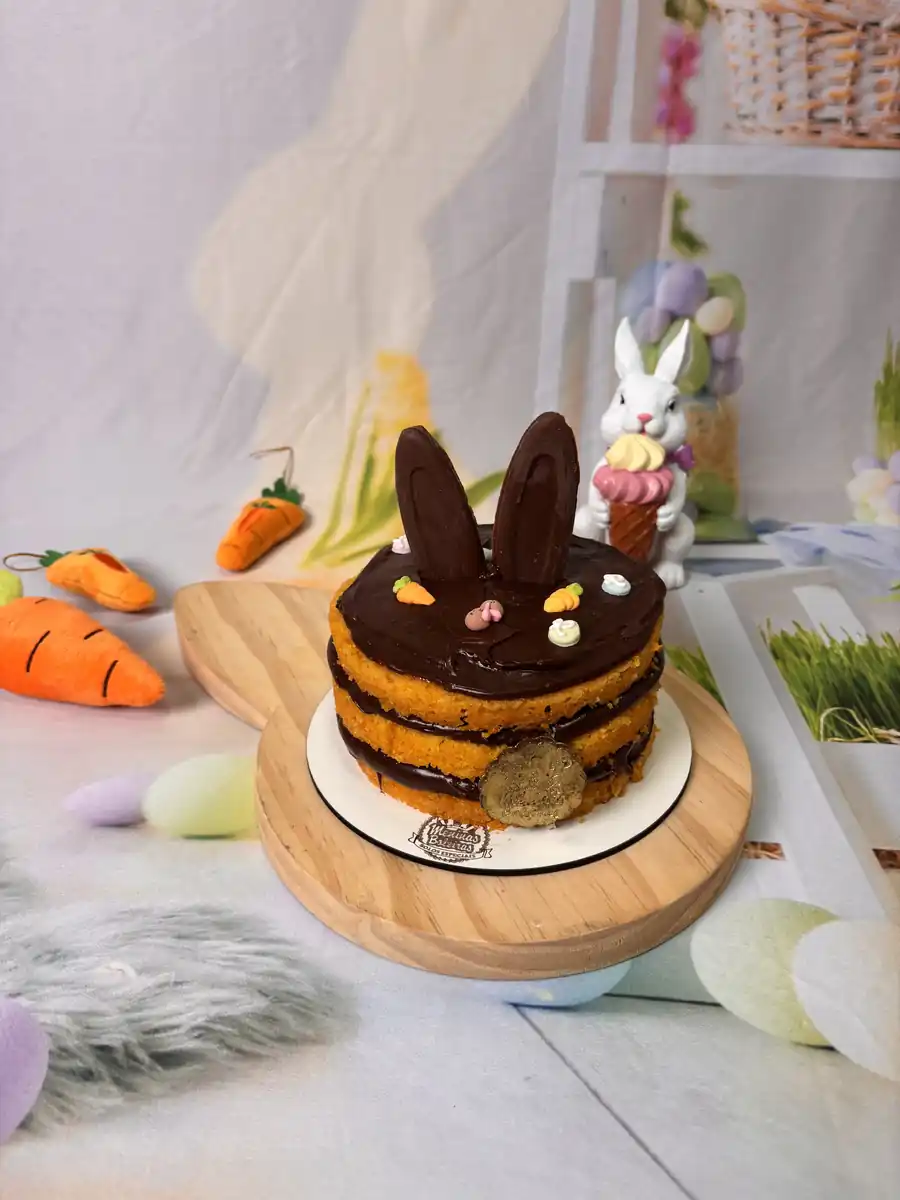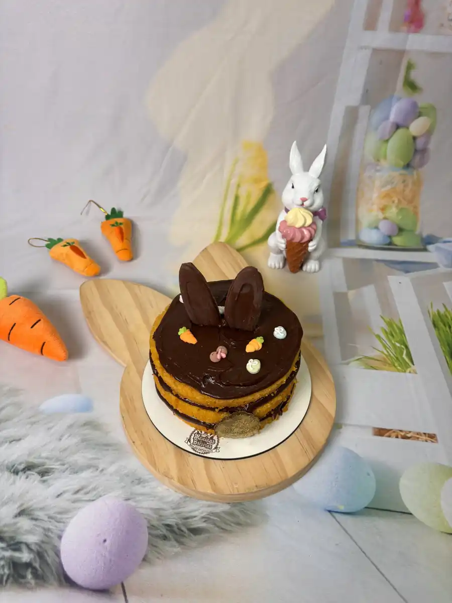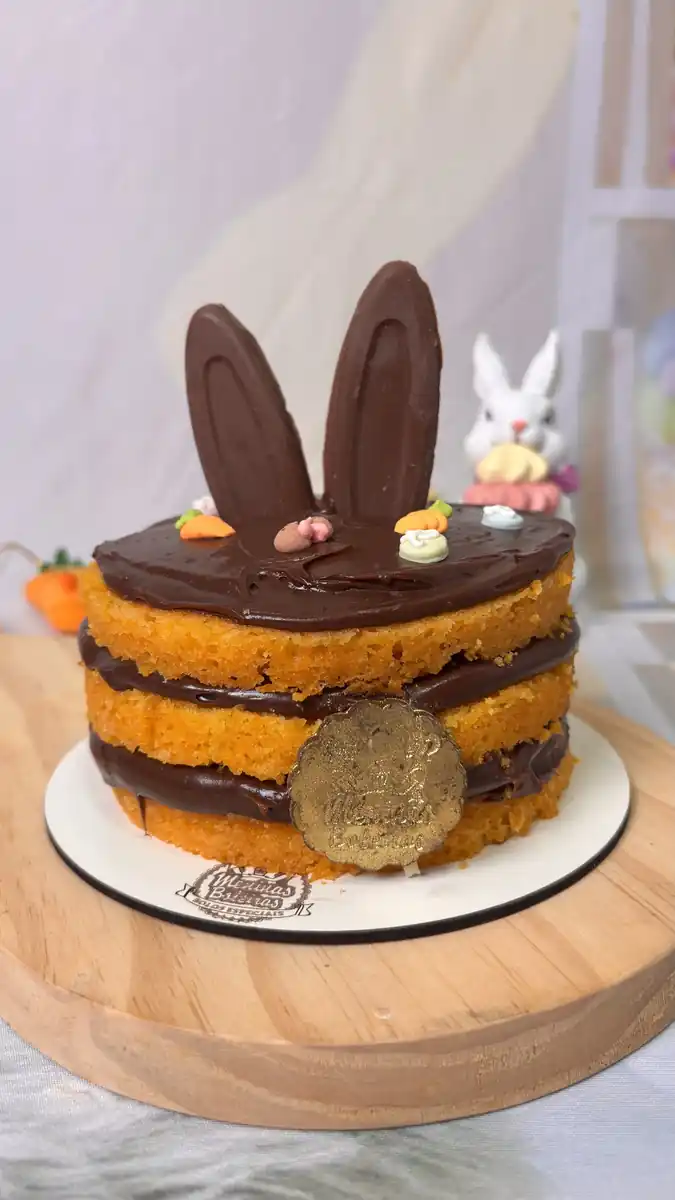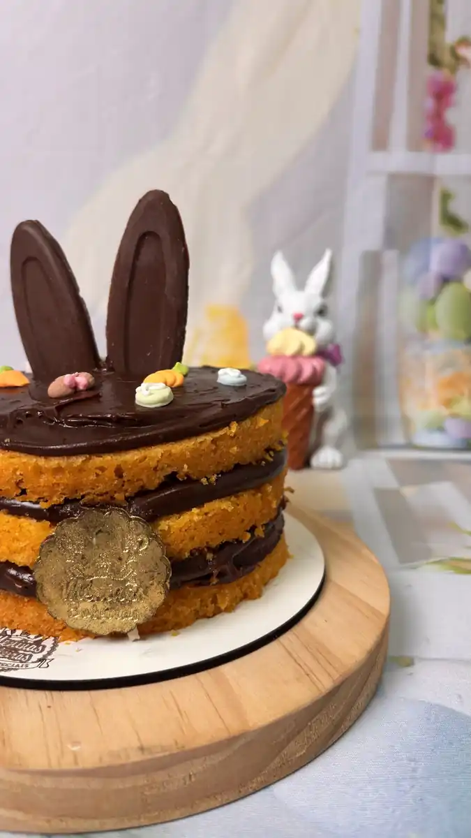 Bolo de cenoura fofo, delicioso e super charmoso para a mesa de Páscoa.